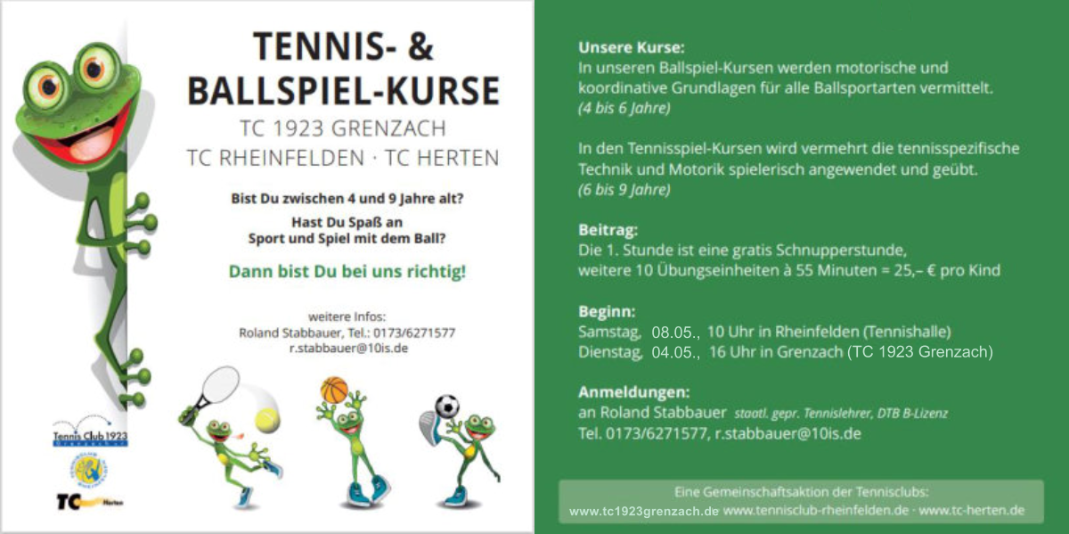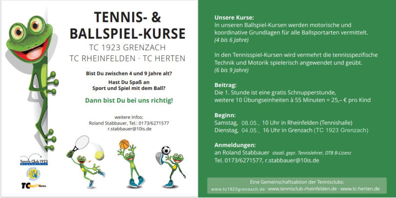 TENNIS- &BALLSPIEL-KURSETC GRENZACH-WYHLENTC RHEINFELDEN - TC HERTENBist Du zwischen 5 und 8 Jahre alt?Hast Du Spaß anSport und Spiel mit dem Ball?Dann bist du bei uns richtig!weitere Infos:Roland Stabbauer, Tel.: 0173/6271577r.stabbauer@10is.de